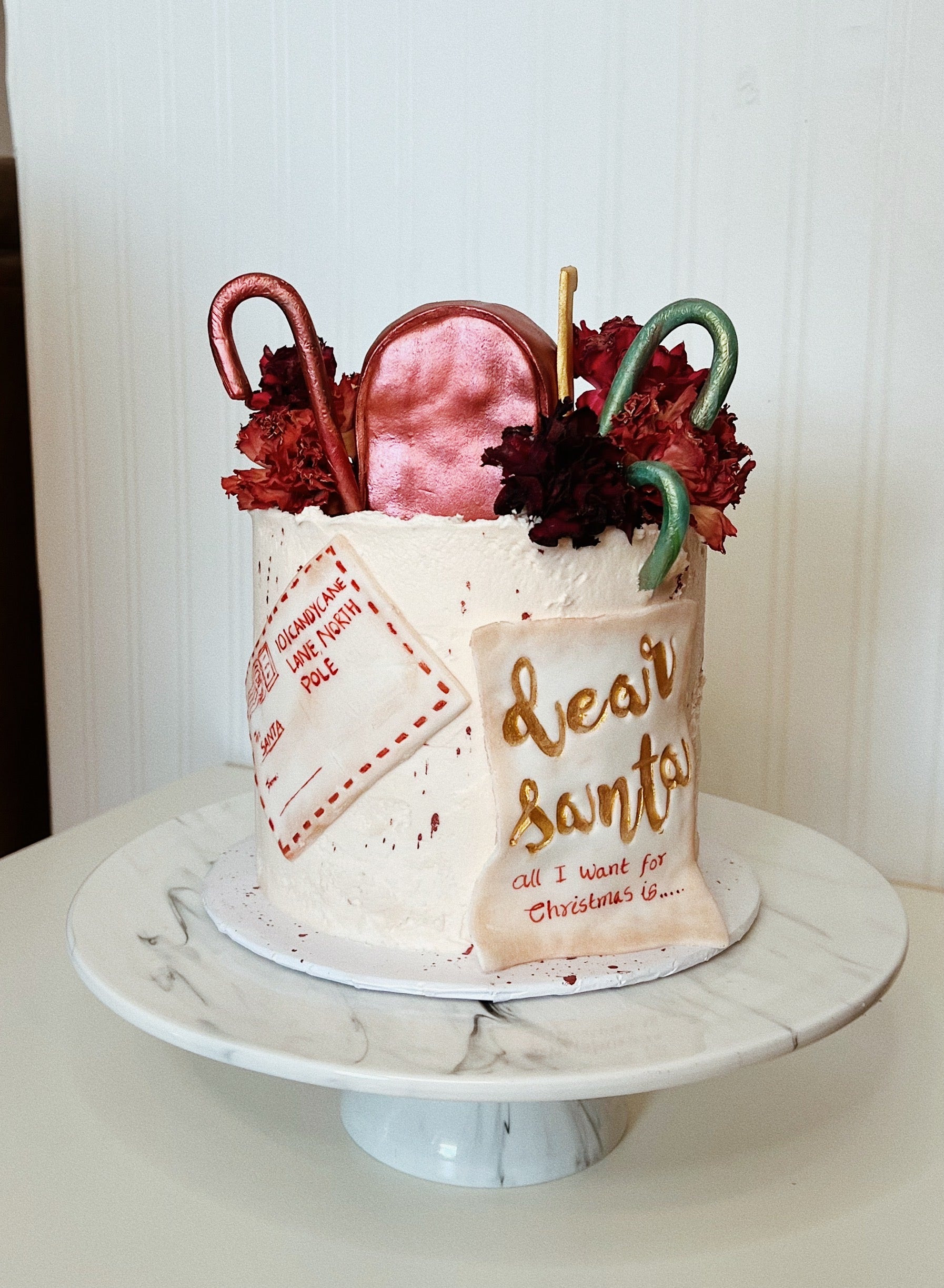 The real magic of this cake lies in the fondant details that showcase the spirit of the season. An edible Santa's mailbox, crafted with care and precision, stands on top, complete with tiny envelopes addressed to the North Pole. Each envelope features the delicate, hand-painted wishes of children from around the world, capturing the true essence of the holiday.
